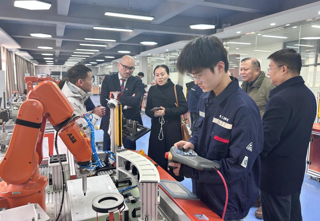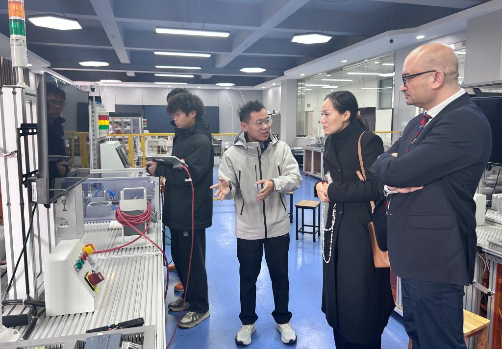 会后,在校领导及对外合作交流处、学工处、机电工程学院相关负责人陪同下,来宾们实地参观了学校的比亚迪产业学院、工业机器人实训基地、智能机器人成果展厅以及学生宿舍等场所。先进的实训设备、丰硕的技术创新成果以及整洁温馨的校园环境给来宾留下了深刻印象。在参观过程中,匈方嘉宾格外关注人才培养模式与未来就业渠道,并与现场师生亲切交流。在产业学院与实训基地,学生们应邀进行了操作演示,其娴熟的技能赢得了来宾们的赞赏。