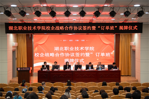 (本网讯 王丹 戴卓 马江浩 李蓓蕾)10 月17日,湖北职业技术学院与华强方特(孝感)文化科技有限公司、万豪国际集团校企战略合作协议签约暨“订单班”揭牌仪式在西区文博馆学术报告厅举行。武汉卓尔万豪酒店总经理高明、万豪国际集团校企合作华中区代表杨骏、华强方特(孝感)文化科技有限公司人力资源部部长万俊涛,我校党委委员、副校长白梦清等出席,教务处、对外合作交流处、财经与旅游学院负责人及订单班学生等共同见证校企携手、开启新程的重要时刻。